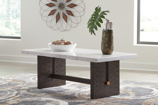 Signature Design by Ashley®Elegance meets earthy charm in this coffee table. Crafting a contemporary living room? The faux Carrara marble top expertly pairs with the reeded b...