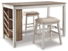 Raise the bar on small space living with the Skempton 3-piece counter-height dining set. An inspired choice for coastal chic or modern farmhouse settings, this strikingly simple table marries a brown tone plank-effect top with a rubbed-through grayish white base for timeworn appeal. The table’s side shelves and 8-bottle wine rack cleverly balance form and function while the comfortably cushioned bar stools serve up high style.