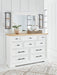 | Details | Includes dresser and mirror, Made with hardwood solids, MDF substrates and butcher block oak veneer, Dresser with 2-tone finish (white finish; butcher block oak veneer with natural finish), Pulls with matte black finish, 10 spacious drawers with fully finished interiors (top drawers felt lined), dovetail construction and ball-bearing side glides , Drawers with inset picture fronts, Mirror attaches to back of dresser | |