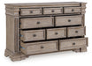 Details Made with hardwood solids, oak and ash veneer, cast resin components and engineered wood substrates, Top with inlaid ash veneer border, Light warm grayish brown glazed wood finish, Round metal knobs with satin nickel-tone finish, 10 drawers with fully finished interior, dovetail construction and ball-bearing side glides, Drawers with inset framed fronts, Breakfront pilasters