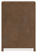 | Details | Made with hardwood solids, hickory veneer and MDF substrates, Light brown glazed finish to enhance the natural wood grain characteristics, Handles with aged pewter-tone finish, 5 drawers with fully finished interior, dovetail construction and ball-bearing side glides | |