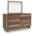 Details Includes dresser and mirror, Made with engineered wood (MDF/particleboard/plywood) and decorative laminate for the right balance of affordability and durability , Warm natural brown finish over replicated walnut grain with authentic touch, Decorative laminate replicates natural or man-made material surfaces with consistent color, pattern and texture, Integrated drawer pulls, 6 smooth-gliding drawers , Drawer interiors are lined with a faux linen laminate for a clean, finished look , Mirror attaches to back of dresser; can also be mounted on wall horizontally or vertically , Safety is a top priority, clothing storage units are designed to meet the most current standard for stability, ASTM F 2057 (ASTM International), Drawers extend out to accommodate maximum access to drawer interior while maintaining safety, Minor assembly required