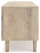 Clean-lined and contemporary—but far from stark—this TV stand is a fresh style awakening. Pairing a light finish with replicated oak grain and textured beige cane details, its mixed materials bring a naturally versatile vibe to your favorite spot for binge-watching or gaming. Sleek, simple hardware plays perfectly with the modern aesthetic. And prepare to have your mind blown by the vast universe of storage possibilities within the spacious drawers and open shelving.