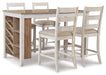 Raise the bar on small space living with this 5-piece counter-height dining set. An inspired choice for coastal chic or modern farmhouse settings, this strikingly simple table marries a brown tone plank-effect top with a rubbed-through grayish white base for timeworn appeal. The table’s side shelves and 8-bottle wine rack cleverly balance form and function while the comfortably cushioned bar stools with classic ladderback styling serve up high style.