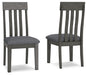 Details Made with solid wood, Antiqued gray finish, Upholstered in gray textural polyester fabric, Cushioned foam seat, Contoured comb-back design, Assembly required