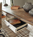 Elevating the art of traditional cottage styling, the Realyn desk set duo is your heavenly home office realized. An antiqued two-tone aesthetic blends a chipped white with a distressed wood tone top for added charm. Framed drawer fronts, decorative corbels and elegantly turned and tapered legs add refinement, while dark bronze-tone knobs lend a classic touch. One desk features a spring lift top which raises the surface to a comfortable standing position, while the second desk caters to computer work with a drop front keyboard tray. Each desk is equipped with built-in charging to keep your devices close at hand and ready to go.