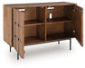 | Details | Made with solid mango wood, Back made with mango wood veneer and engineered wood substrate, Medium brown finish, 2 push magnet doors, 2 fixed shelves, Openings in back for electronics, Minor assembly required, simply lay flat and attach feet | |