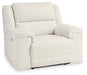 This oversized power recliner seamlessly complements your contemporary cozy space. Bold block arms accentuated with form-fitting padding lend a high-style silhouette. An ample seating area invites you to sprawl during binge watches and relaxed reading hours alike. And with reclining at the press of a button, this piece proves chic design and superb comfort go hand in hand.