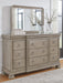 Details Includes dresser and mirror, Made with hardwood solids, birch veneer and MDF substrate, Light gray finish enhances the natural wood grain, Ring pull hardware, 9 drawers with fully finished interiors, dovetail construction and ball-bearing side glides, Jewelry drawer conveniently located in the center valance, Mirror attaches to back of dresser