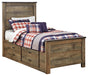Whether she loves horses or he's a cowboy at heart, this twin panel bed with under bed storage matches their authenticity. Its rustic finish, plank-style details and nailhead trim pay homage to reclaimed barn wood, making for a chic look loaded with charm. Mattress available, sold separately.
