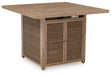 | Details | Includes gas fire pit table with CSA-approved 55,000 BTU stainless steel burner, glass beads, burner cover and all-weather protective cover, All-weather resin wicker woven over aluminum frame, Driftwood finish, Stainless steel hardware, Battery-operated ignition system with adjustable flame control; battery included, Cabinet door conceals gas propane tank (not included), Seats up to 8 (bar stools sold separately), Assembly required, Connection to propane tank or connector hose not provided | |