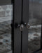 Details Made with hardwood solids, mango wood veneer and MDF substrates, Top with butcher block veneer pattern in rich brown wood-tone finish, Base with warm satin black finish, Hardware with dark bronze-tone finish, 2 glass door storage cabinets, each with adjustable shelf, Adjustable shelf , Cutouts for cord management, Electric fireplace insert provides up to 4,608 BTU/1,400W and warms up to 400 square feet (heats a mid-size room) , 6-level temperature setting; 5 levels of flame brightness; LED-lit flame operates with or without heat , Option for placing faux glass crystals or stones (included) , Overheating control device , Remote control with LED display; power cord included; UL Listed , Assembly required; simply remove the center shelf and back panel to make room for the fireplace insert